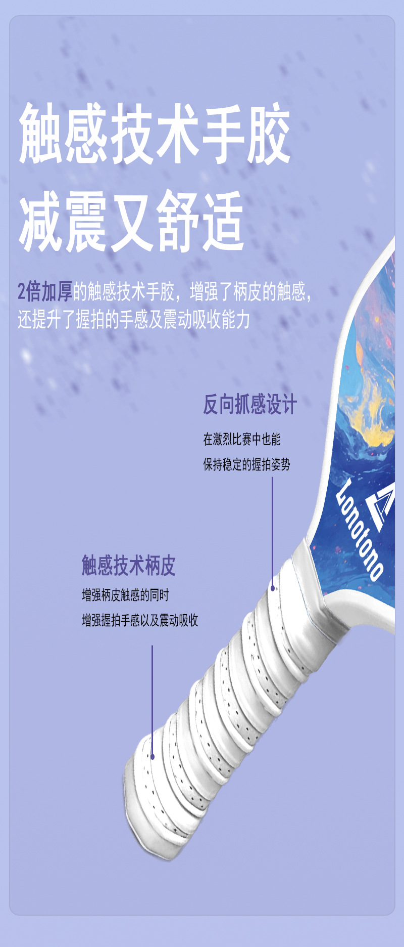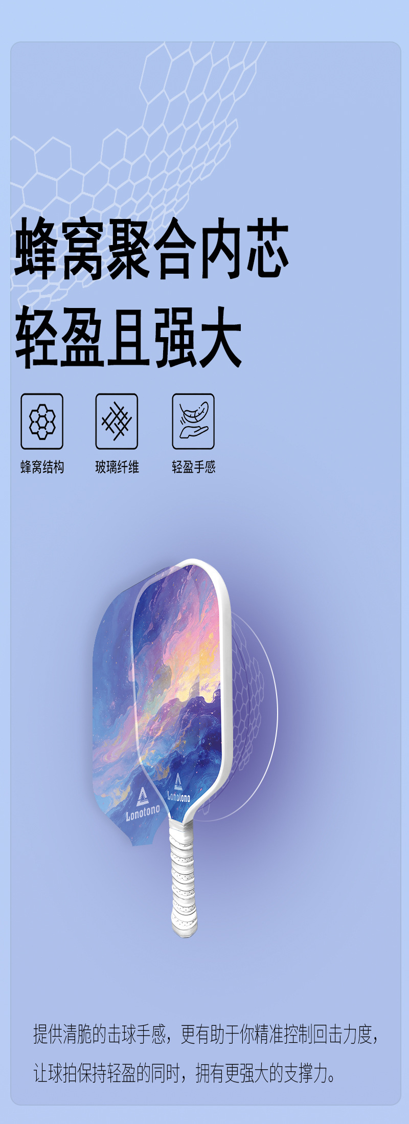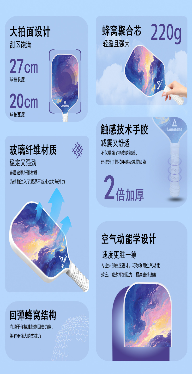 Entry-level pickball racket made of fiberglass with a large sweet zone shock-absorbing and anti-slip handle