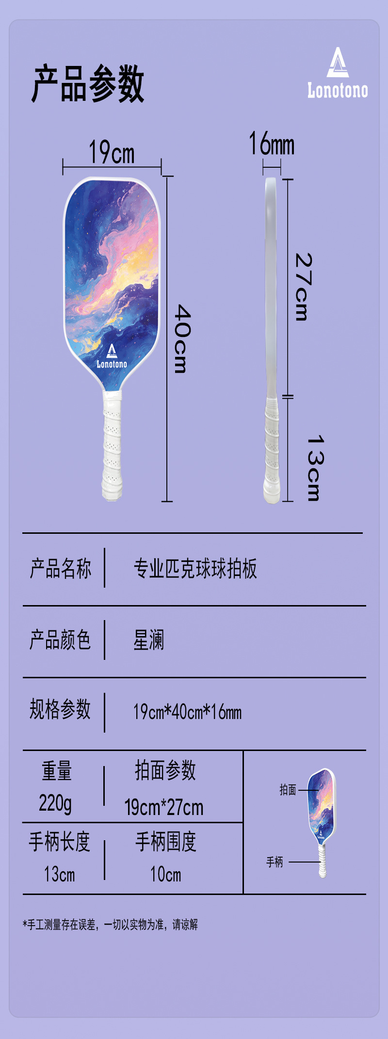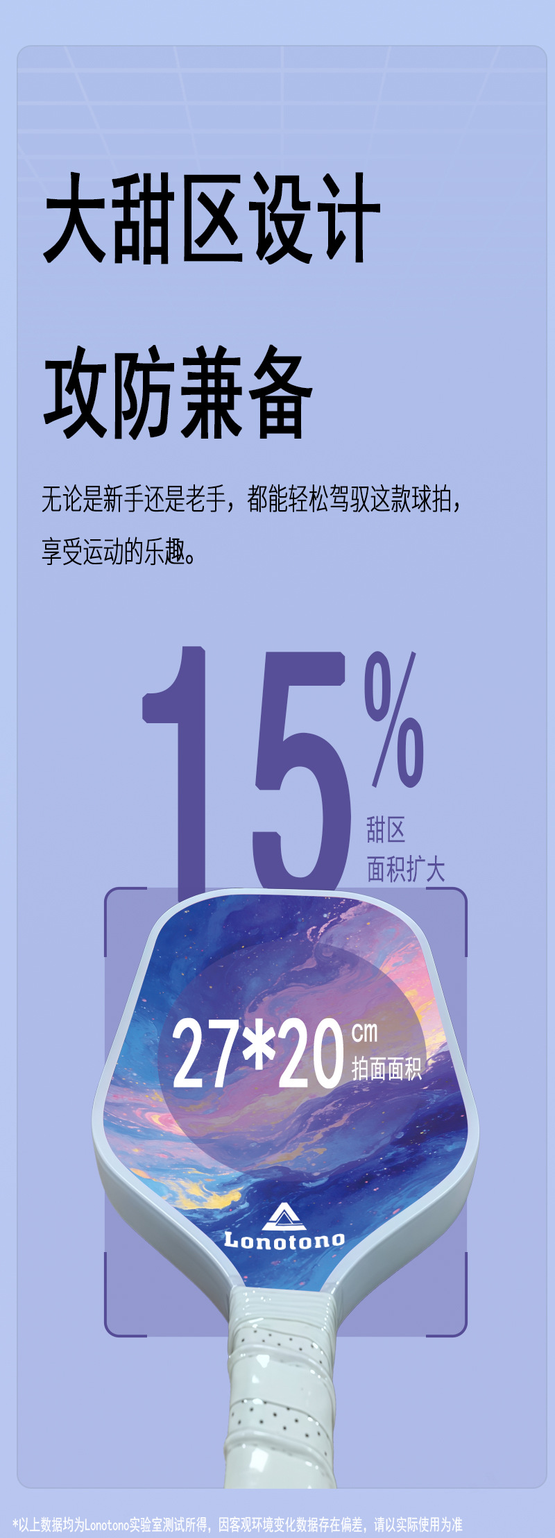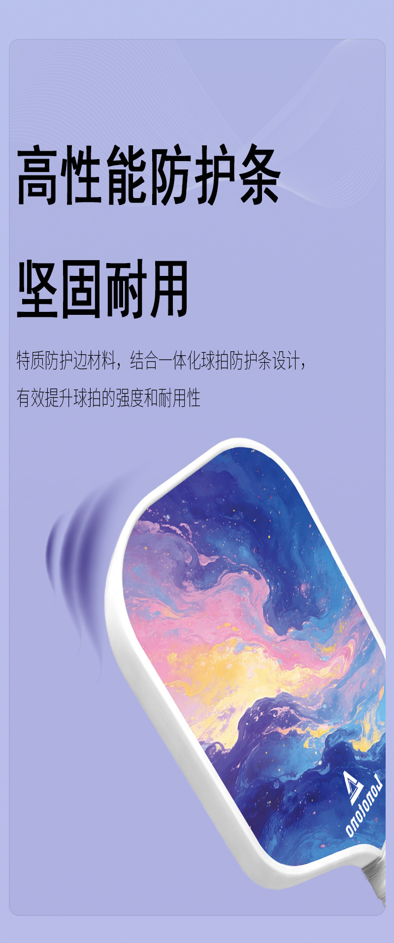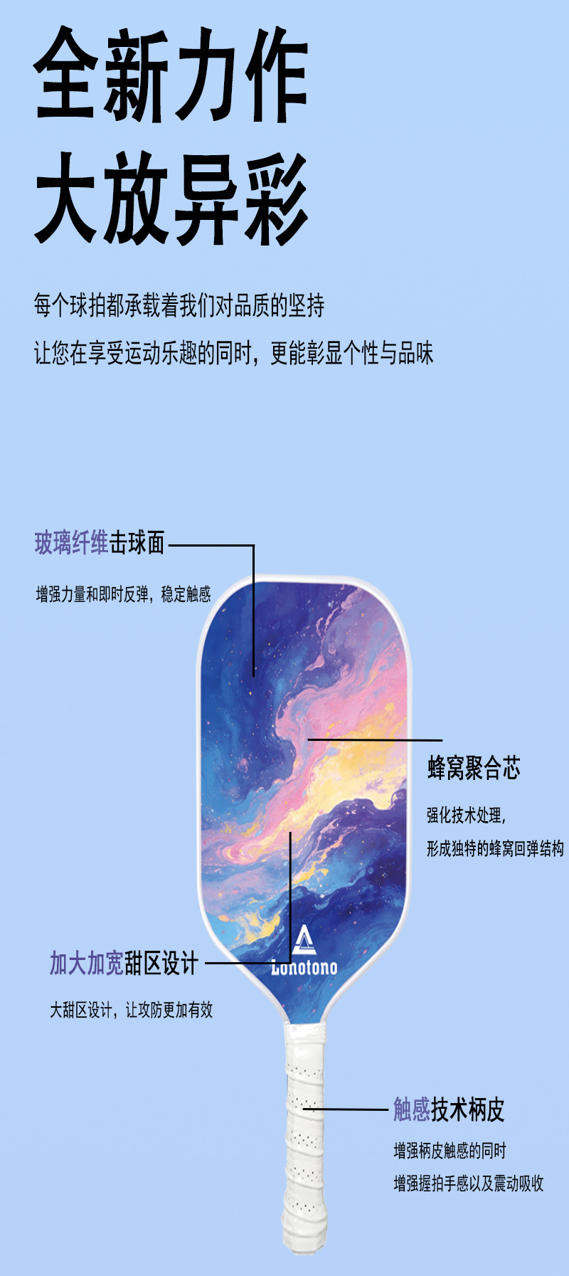 Entry-level pickball racket made of fiberglass with a large sweet zone shock-absorbing and anti-slip handle
