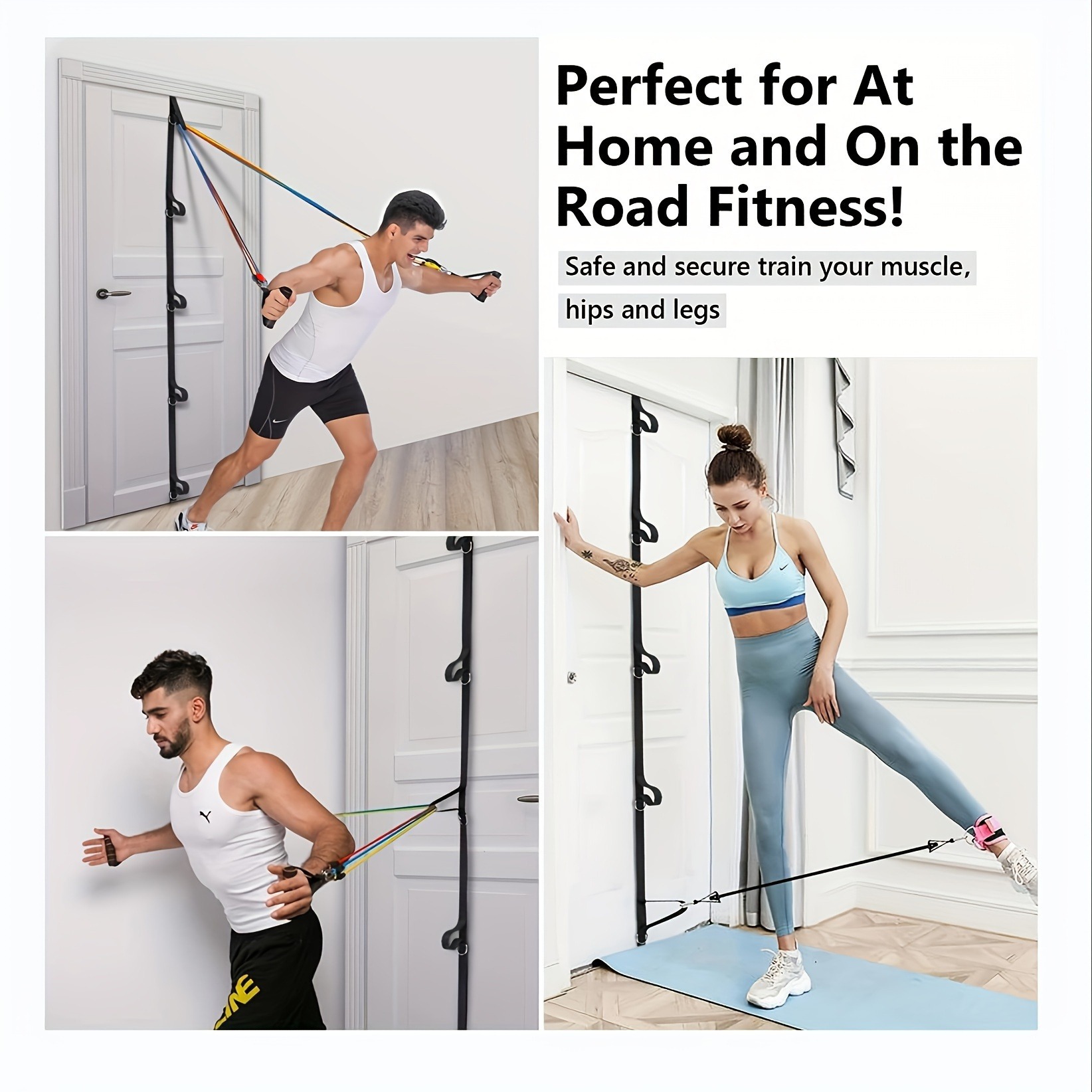 Multi-functional home fitness equipment: elastic rope, multi-point door anchor belt, door latch, tension rope, door clamp, and training belt on the door