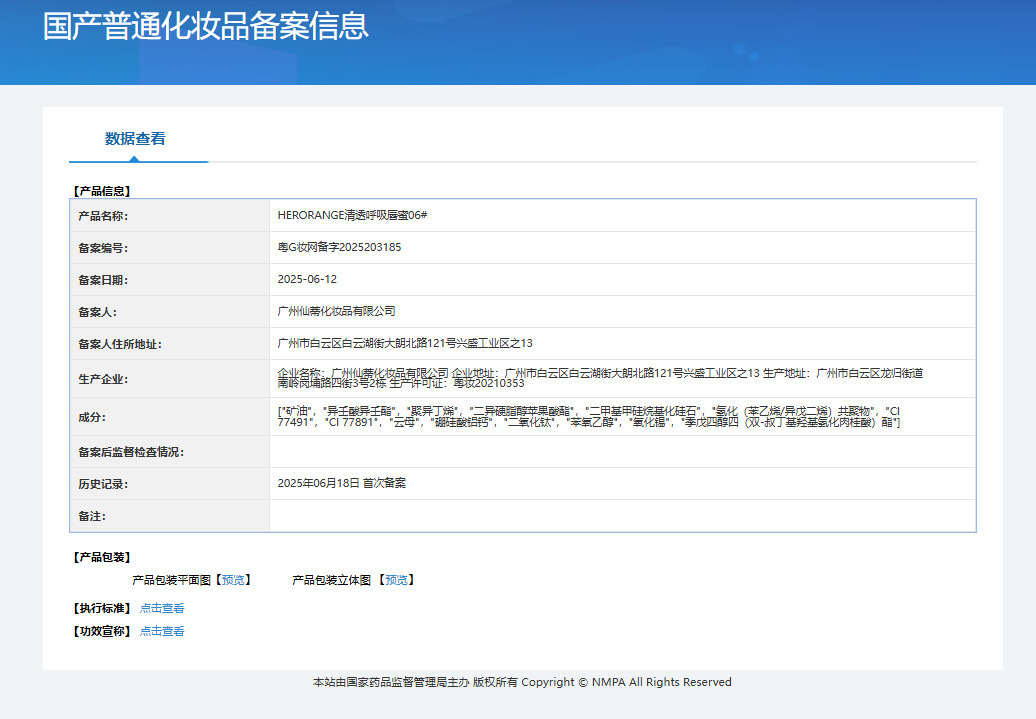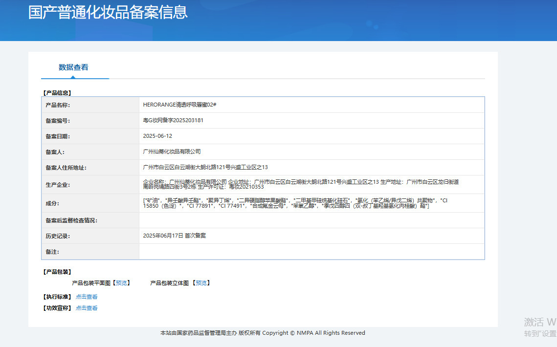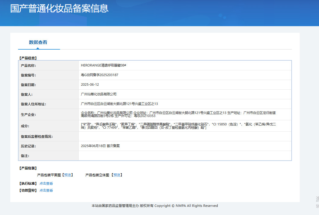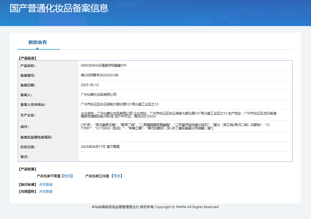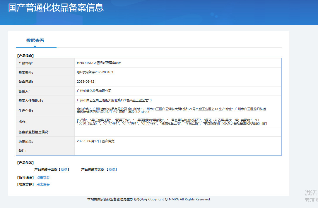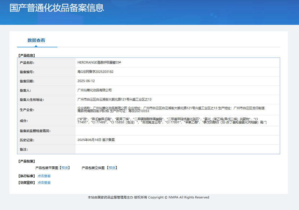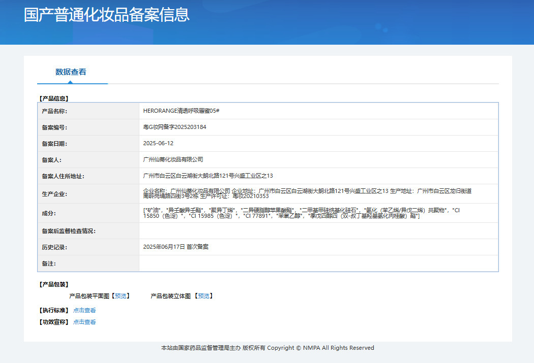| Non-special cosmetics filing certificate number | Registration number of Yue G Zhuang Network: 2025203180 |