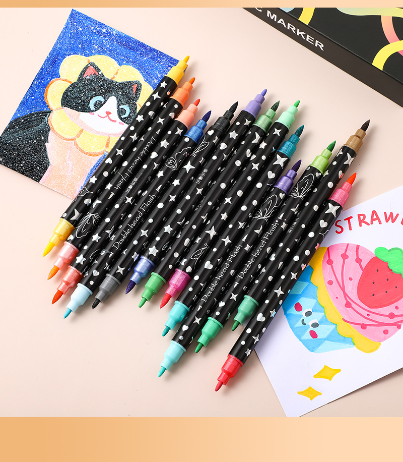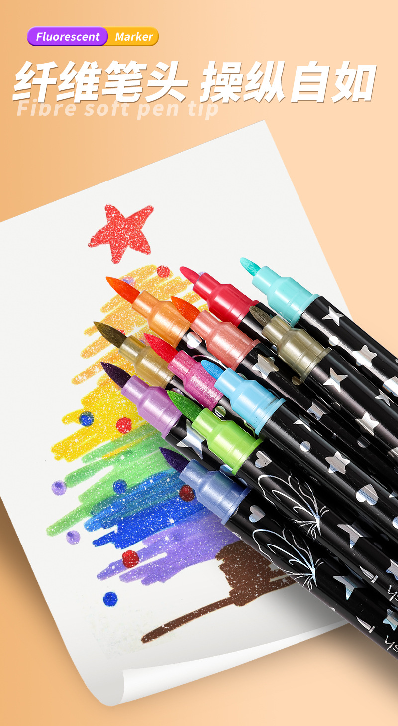 Colorful double-headed soft-tipped metal paint markers, golden star signature pens, student DIY black card paper notebook pens
