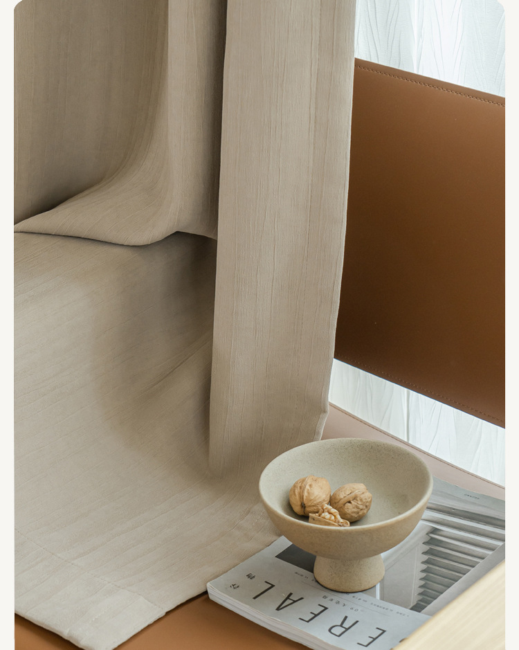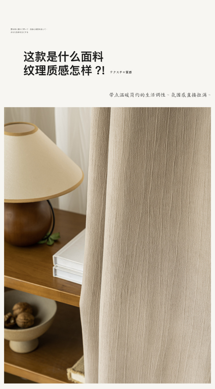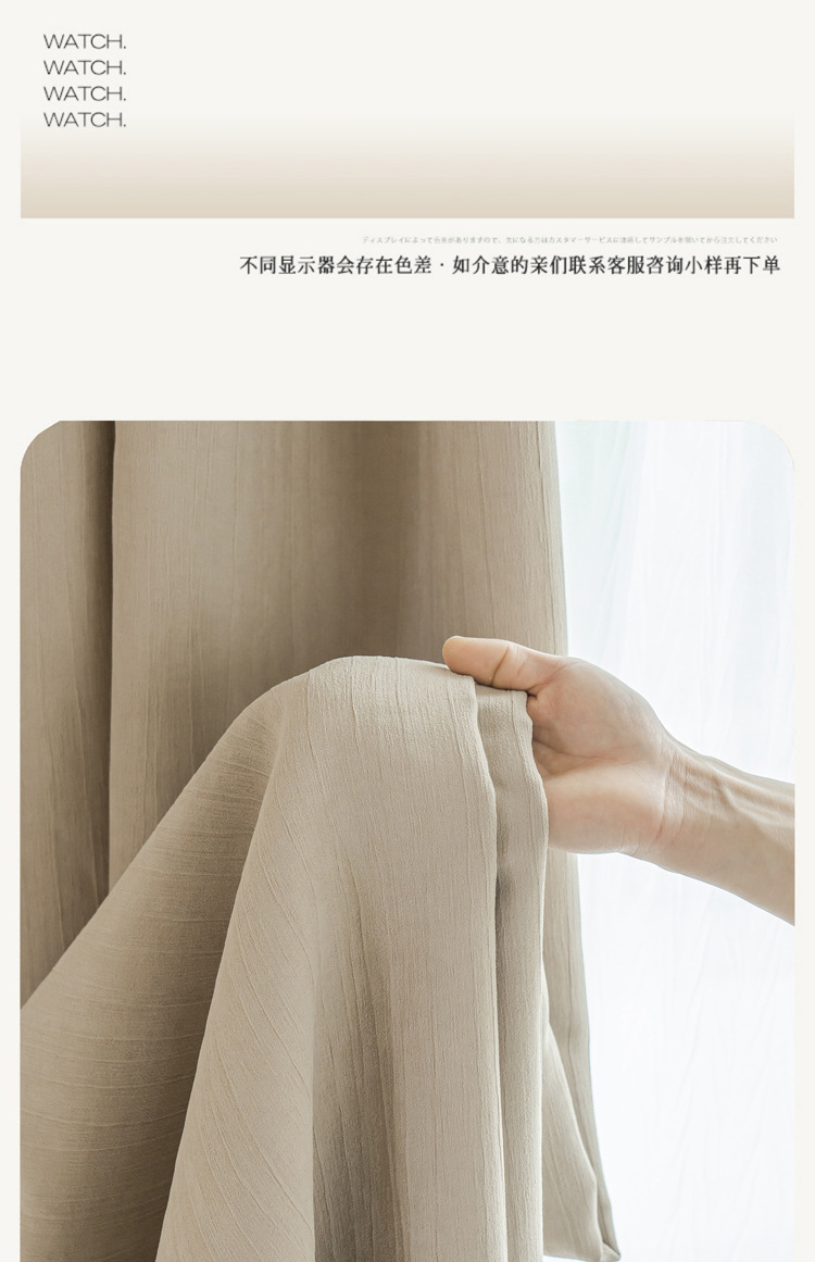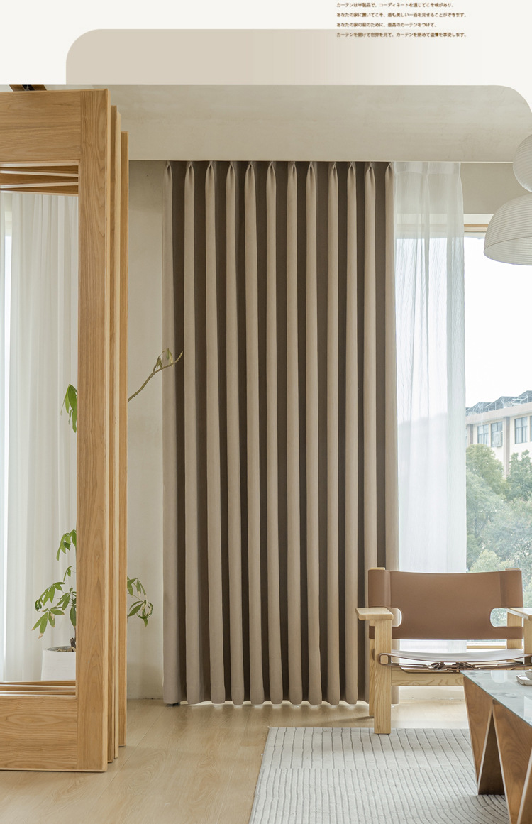 The bedroom curtains are fully blackout in 2024, featuring a cream-style design by the blackout master Chenille. The living room exudes a light luxury feel with thickened fabric